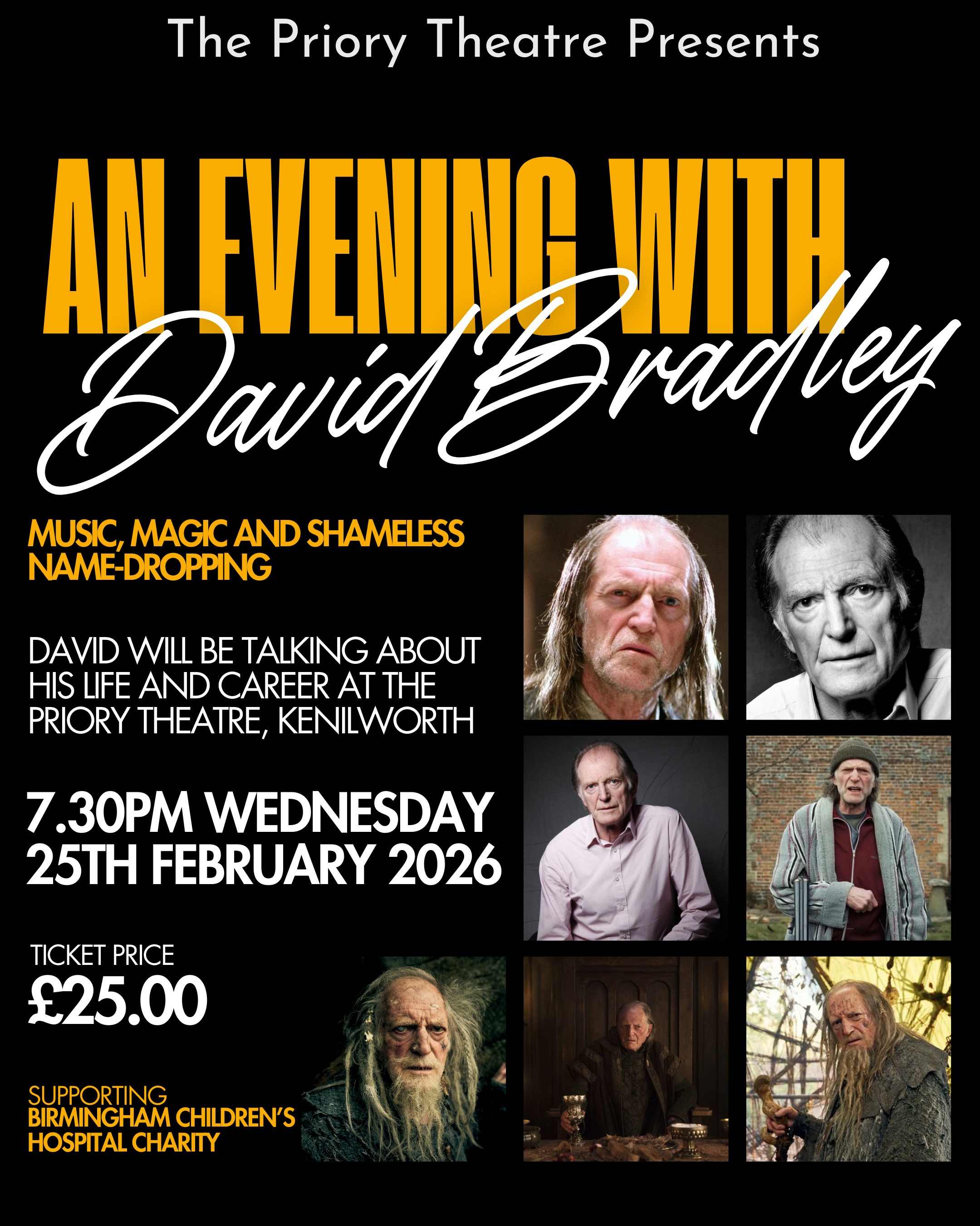 Spend an unforgettable evening with BAFTA award winner and acclaimed actor David Bradley, celebrated for his iconic performances in Harry Potter, Game of Thrones, and Doctor Who.