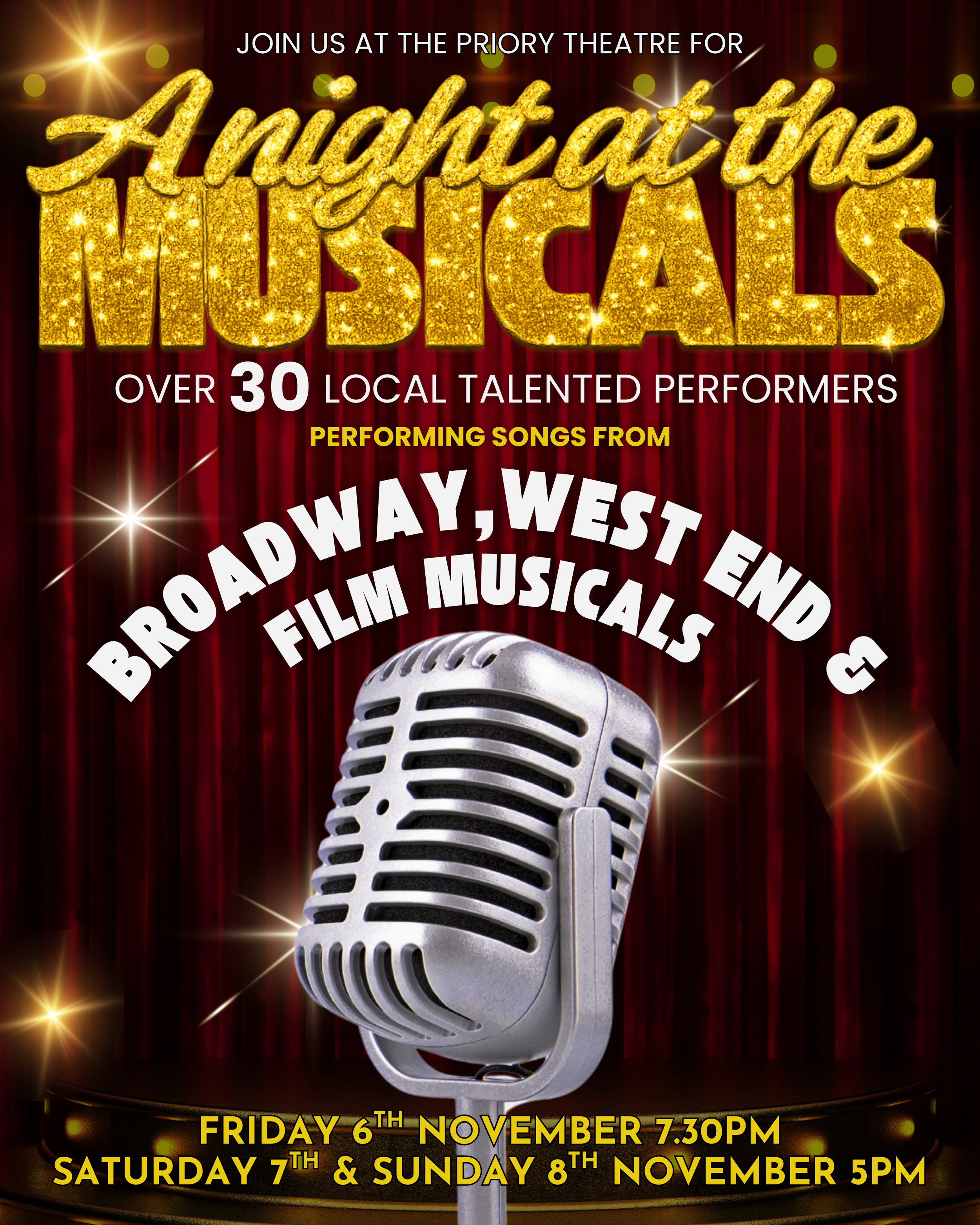 Get ready for a spectacular evening of musical theatre as A Night at the Musicals takes to the stage at The Priory Theatre. Featuring over 30 talented local singers, this vibrant show will transport audiences from the bright lights of Broadway to the magic of the West End, with a few beloved film musical favourites along the way.