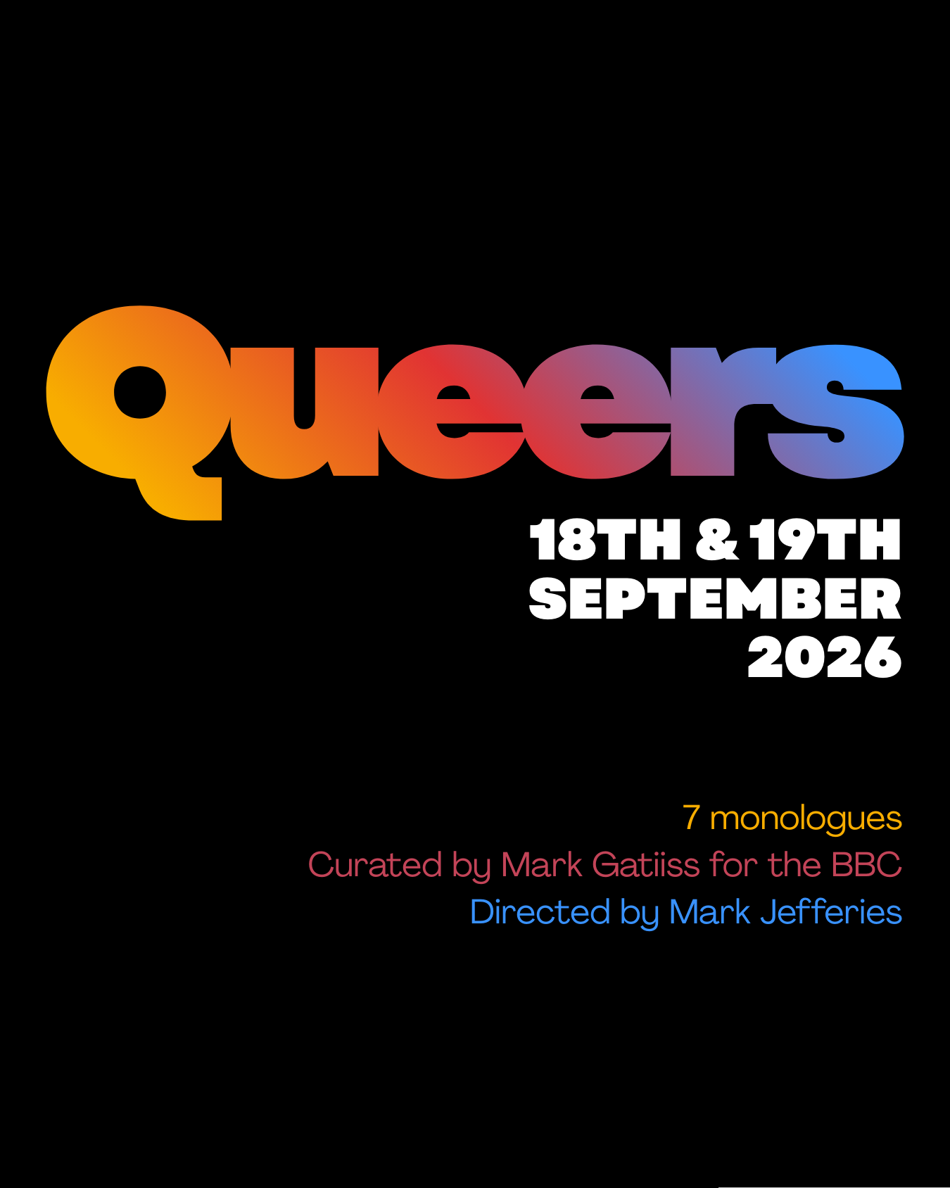 Curated by Mark GatissDirected by Mark JefferiesQueers is a set of seven poignant and personal, funny, tragic and riotous monologues for both male and female performers covering 100 years (1917 to 2016) of major events in each decade. Curated by Mark Gatiiss for the BBC, the monologues celebrate a century of evolving social attitudes and political milestones in British gay history, as seen through the eyes of seven individuals.